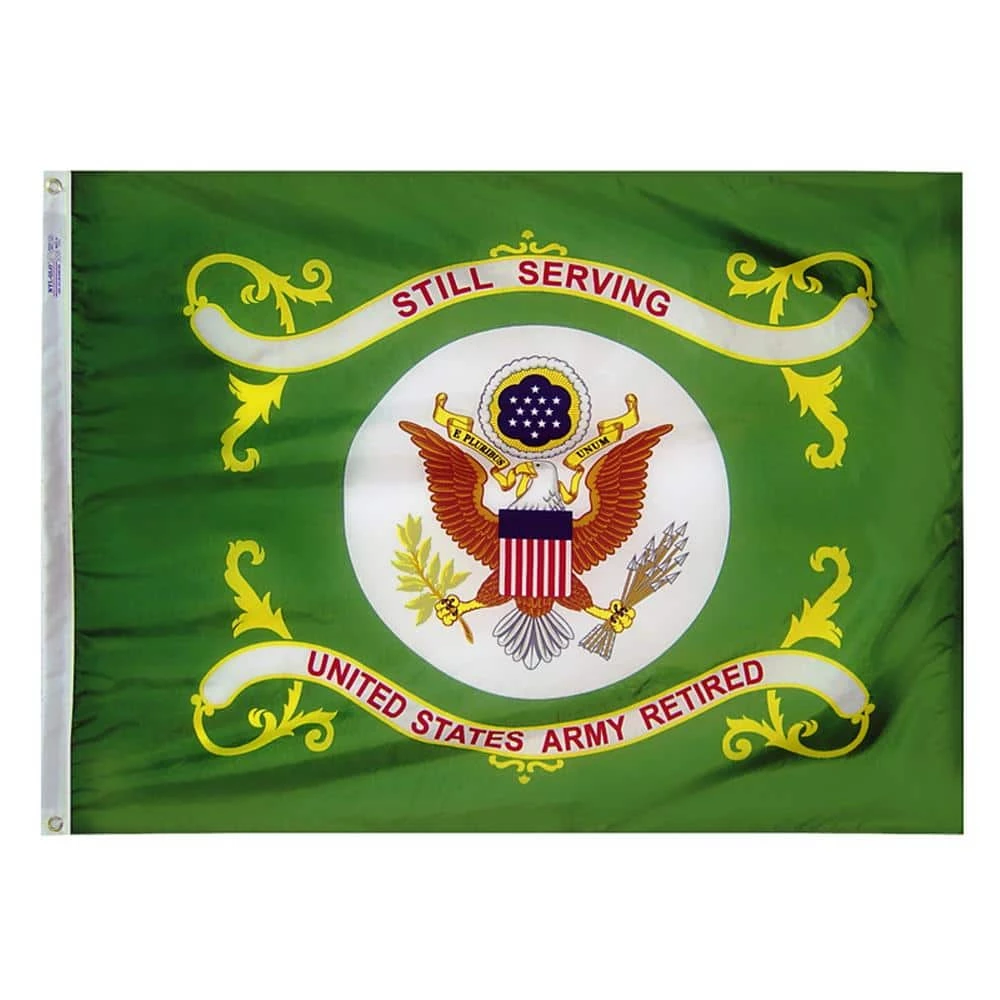 Show Your Support for our Retired Military Personnel with the Annin 3 ft. x 4 ft. Army Retired Flag. This flag is made of sturdy nylon and designed to fly in the lightest breeze. The Flag is grommeted and attaches quickly and easily to your flagpole. Annin is an Officially Licensed Manufacturer of Military Flags.