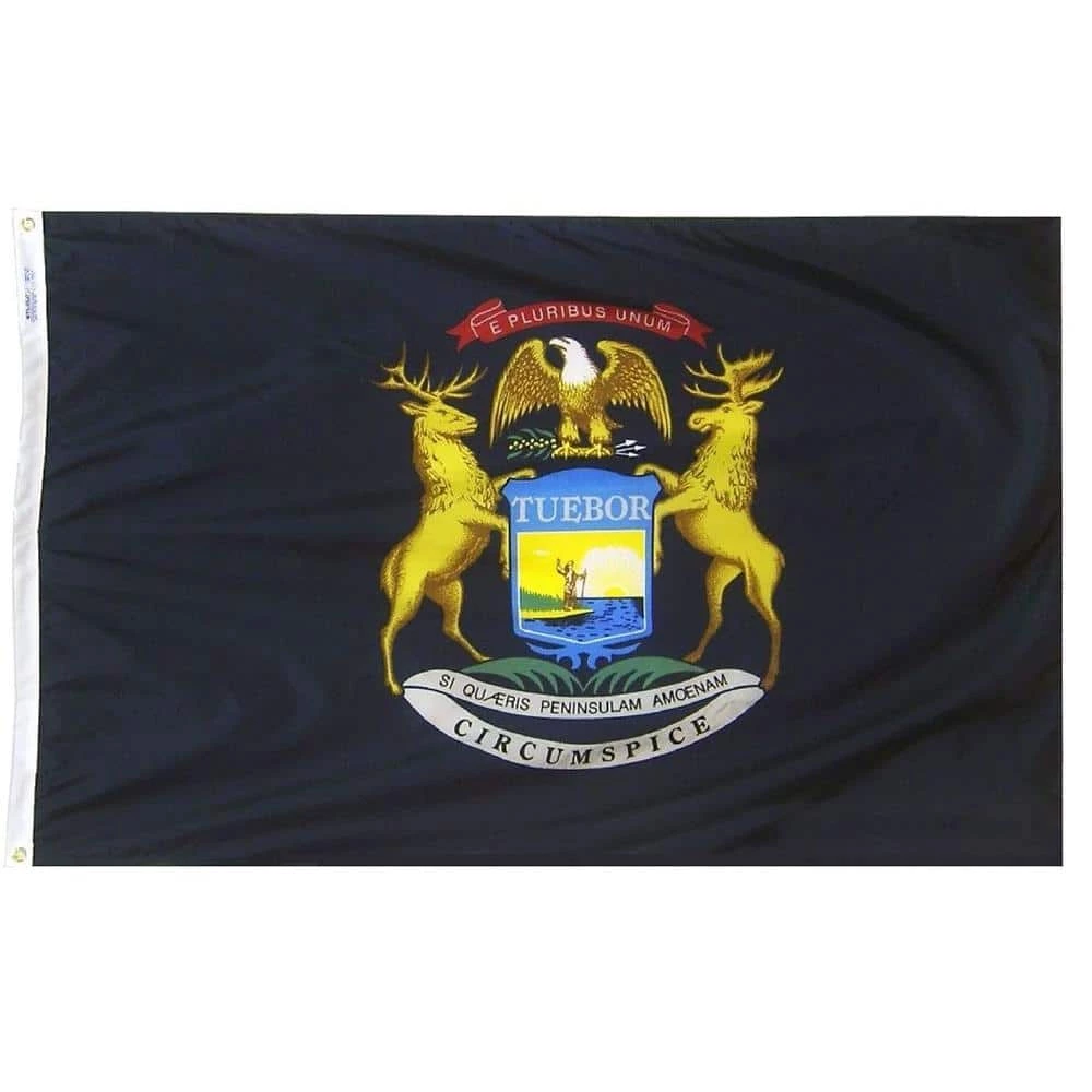 Annin’s 5 ft. x 8 ft. Michigan State Flag is made from Heavy Weight SolarMax Nylon. The Nylon material has bright colors and flies beautifully in the lightest breeze. Attaches to your flagpole quickly and easily.