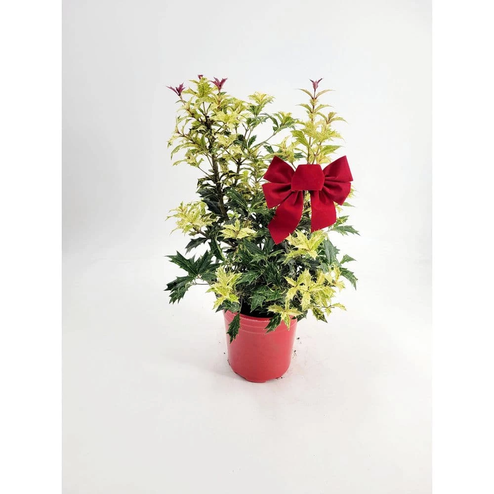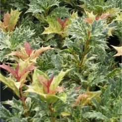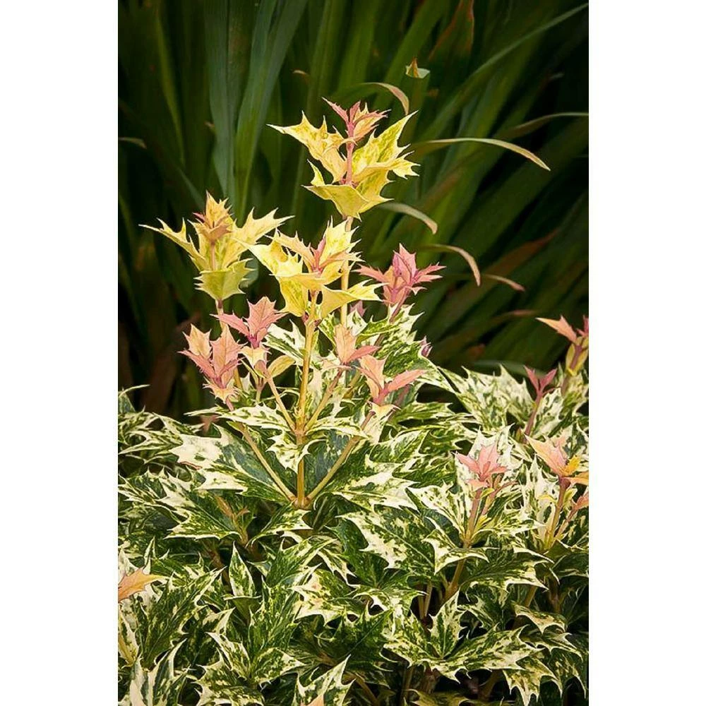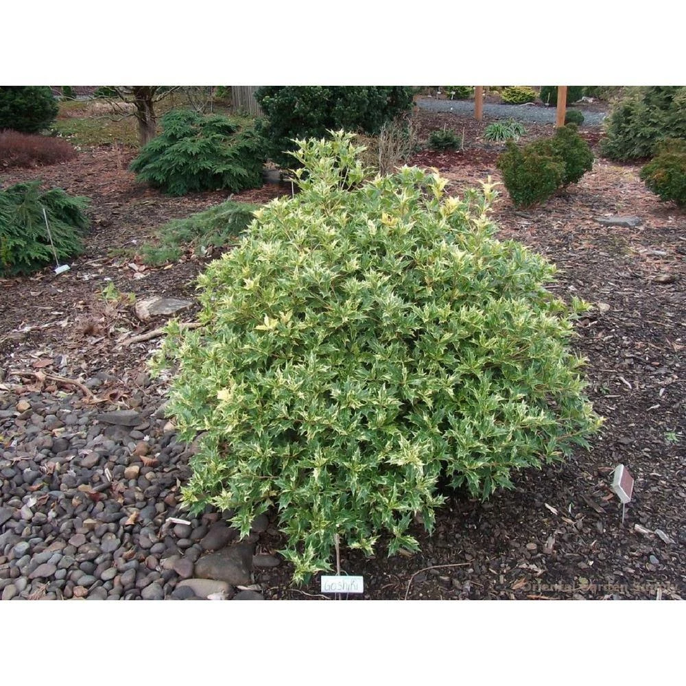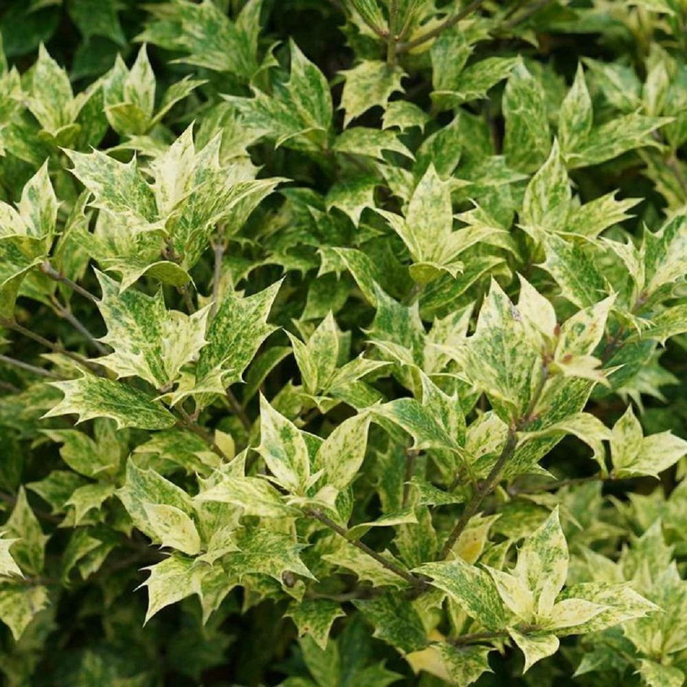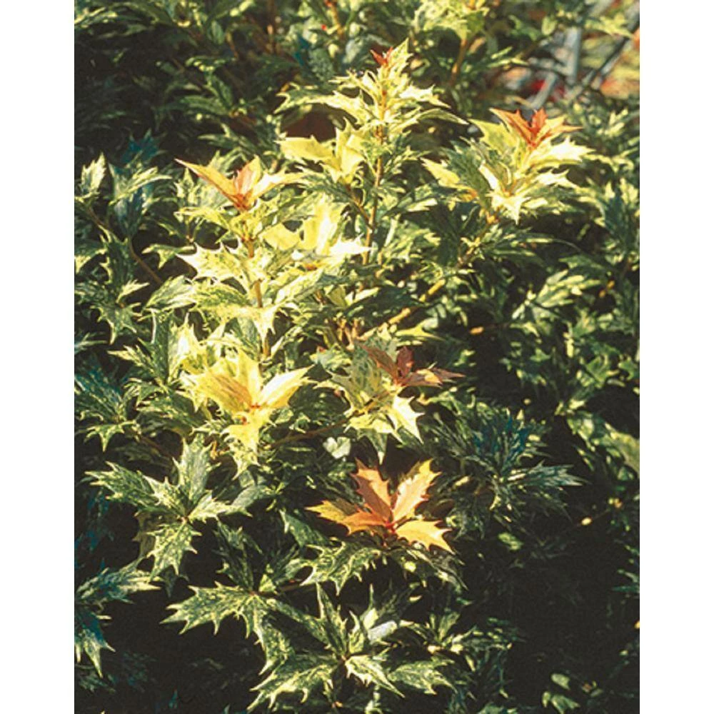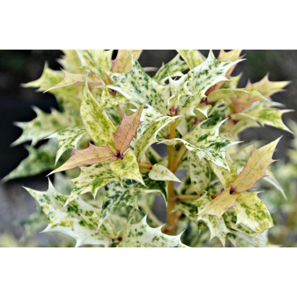 Goshiki Osmanthus is a beautiful compact live evergreen shrub that matures at 3-5 ft. tall and 3-4 ft. wide. This unique variegated shrub has a mixture of five different colors: creamy white, dark green, light green, yellow and burgundy. Blooms fragrant small white flowers that attract bees and butterflies. Plant your Goshiki Osmanthus in areas with full sun to partial sun for optimal growth. It is best to prune back in later winter or early Spring to prep for new leaves to come. Goshiki Osmanthus is ideal for low hedges, borders and landscape