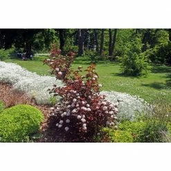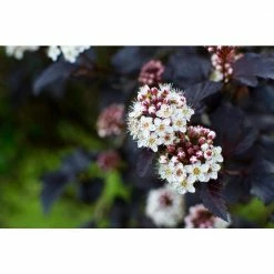 Diablo Ninebark has a unique look of deep dark purple foliage combines with creamy white cluster flowers. This Shrub thrives in Full sun. Excellent choice for garden beds, dense hedges or screens. It will reach 10 ft. tall and 10 ft. wide.