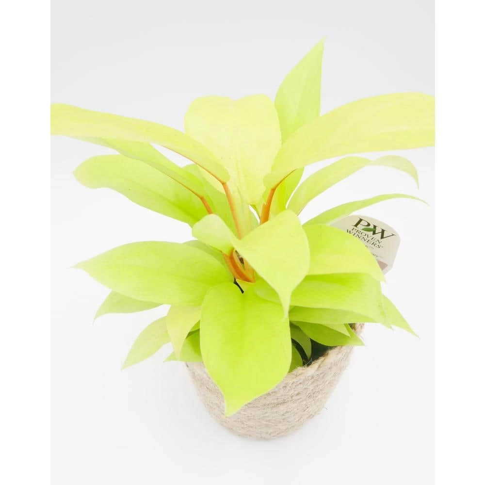 Philodendron Lemon Lime is a cultivar of the Heartleaf Philodendron. Foliage displays a splash of lime green color with stems that can grow up to 12 in. Originated from Central and South American rainforests, this Philodendron thrives in bright indirect light, warm temperature and a good amount of water to keep soil moist. Always let the water drain all the way through when watering plant. Philodendron Lemon Lime can be planted in pots or hanging baskets, either way this indoor tropical plant will add a significant vibrant color to your home.