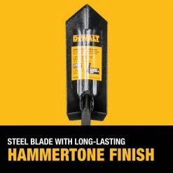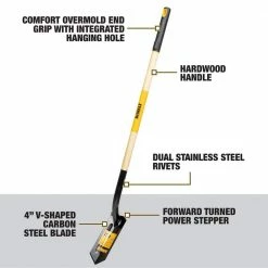 Remove loose soil for spillway, ditch, and trench clear-out with the 46 in. Hardwood Handle Trenching Shovel. This Trenching Shovel swiftly breaks apart compacted dirt with a sharp, 4 in. carbon steel blade and a durable, multi-step hammertone finish. The functional V-shaped head is designed to help expedite the digging and removing process while an integrated hanging hole allows you to conveniently store it at the end of the day. Power through almost any ditch-digging project with an forward turned power stepper and power collar engineered to deliver strength and balance as stainless steel rivets maintain a reinforced shovel head-to-handle connection. Reduce stress on the knees and back with the long-length, natural hardwood handle and overmold end-grip which provides comfortable handling during prolonged use.