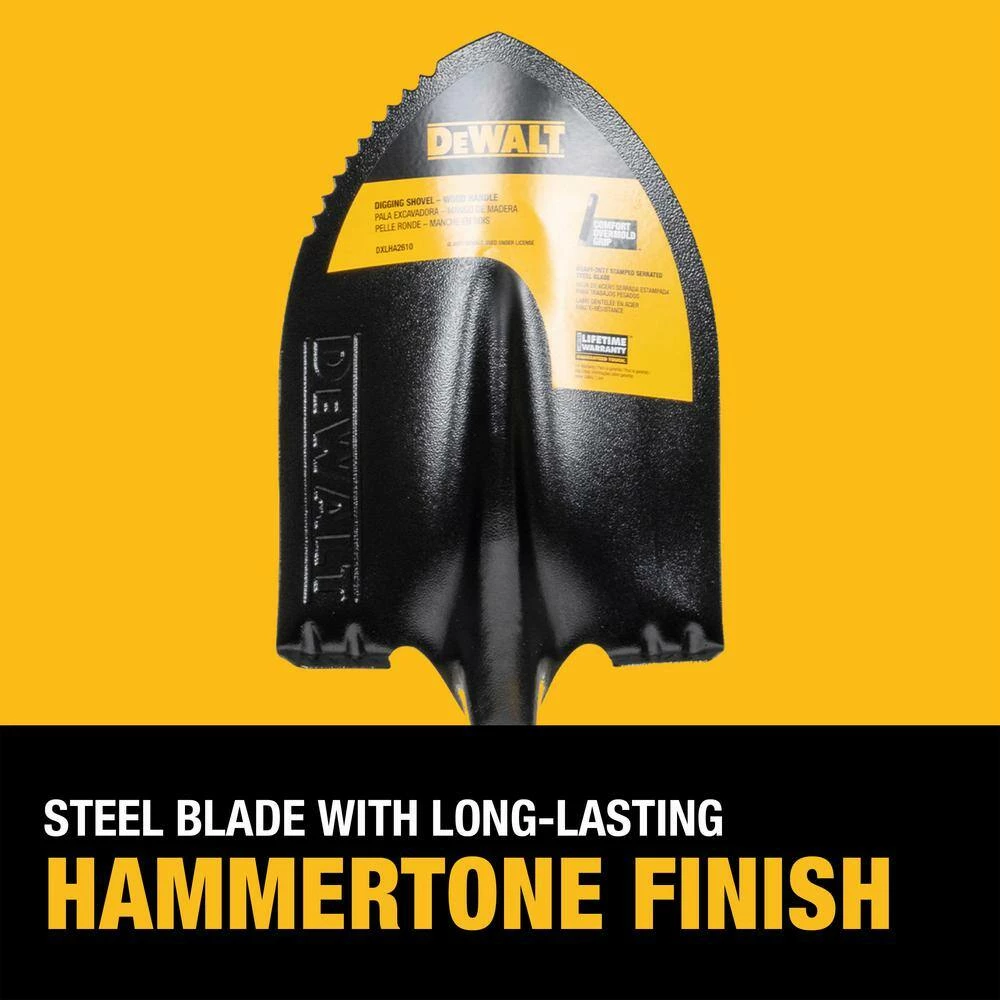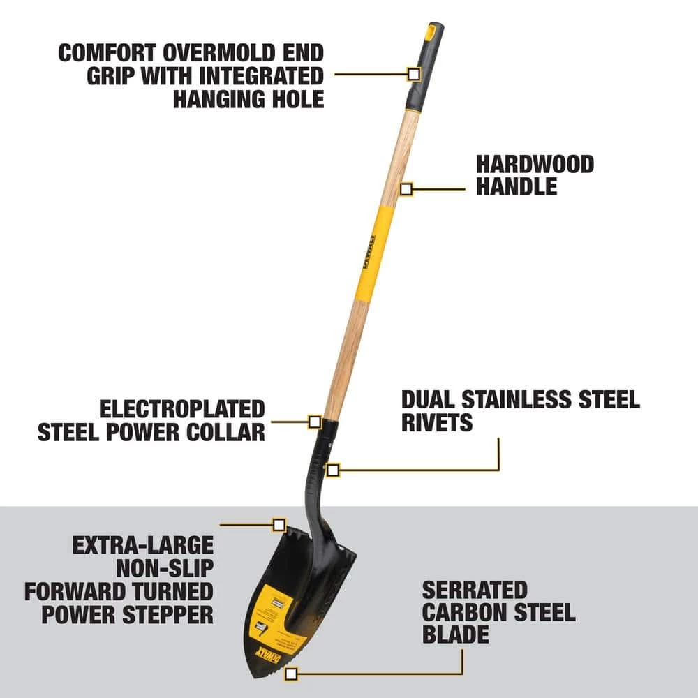 Thoroughly tested for real-world toughness and professional-grade reliability, this 49 in. Hardwood Handle Digging Shovel was built to help you tackle an expansive range of work. Break apart dense soil with the heavy-duty carbon steel blade which features a multi-step hammertone finish designed for durability. Great for digging a variety of holes in different types of soil, the tool features an integrated hanging hole for convenient storage when the day’s work is finished. Take on almost any digging job with an extra-large forward turned punch embossed power stepper and steel power collar, while the dual stainless-steel rivets keep the shovel head attached to the handle for long-term use. Reduce back and knee strain during extra-long work days with the long, natural hardwood handle while the overmold end-grip provides comfortable handling during prolonged use.