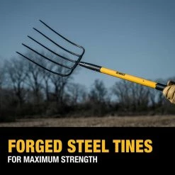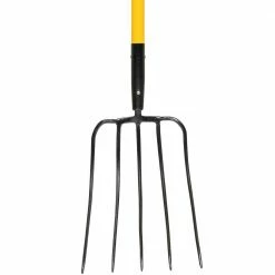 Efficiently spread and move loose garden material with this 52 in. Fiberglass Handle 5-Tine Fork. Rigorously tested for real-world toughness, this heavy-duty bedding fork with 5 forged steel tines was engineered to seamlessly move and spread manure, mulch, woodchips, hay, and more. The strong forged steel head remains securely attached to the handle as you work thanks to dual stainless steel rivets, and its integrated hanging hole allows for easy storage at the end of the day. Reduce strain on the back and knees during those extra-long days with the heavy-duty weather resistant fiberglass handle. Plus, the overmold end-grip and mid-grip provide a comfortable grip and pro-grade leverage.