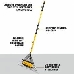 - PRO-GRADE STABILITY AND PERFORMANCE: One-piece continuous 24-tine steel rake with spring back attached to heavy-duty weather resistant fiberglass handle