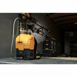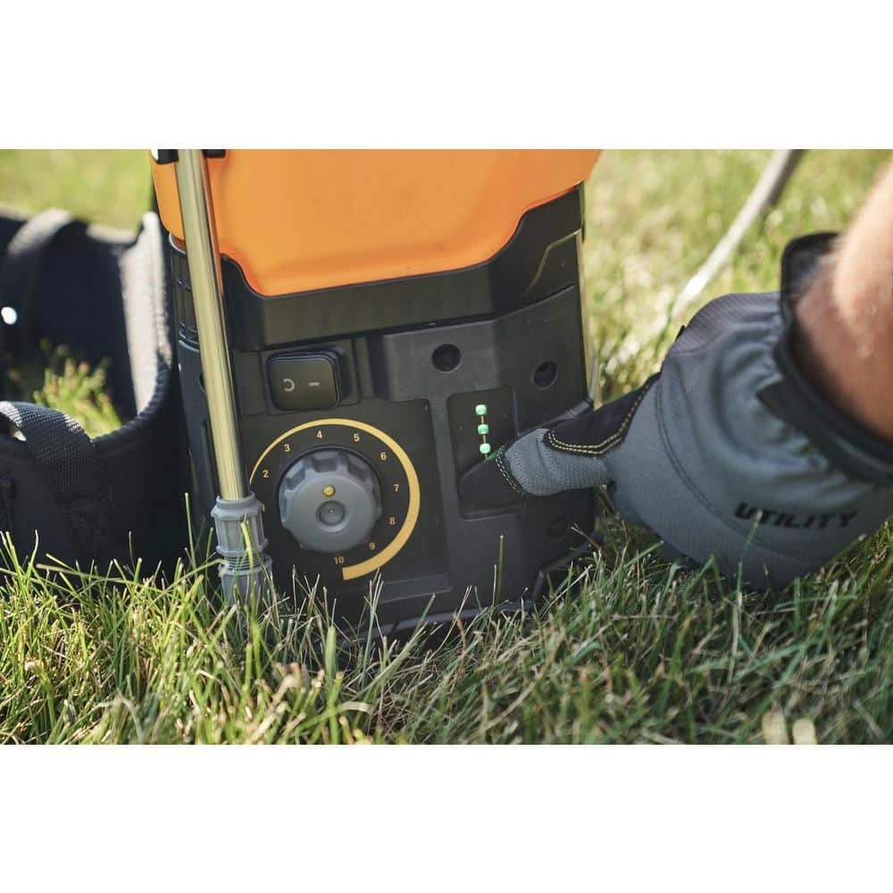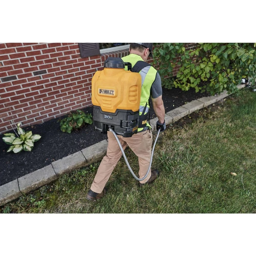 The DEWALT 4 Gal. Lithium-ion Powered Backpack Sprayer has been built to outperform, outlast and finish the job in less time – with no more pumping. The lithium-ion powered backpack sprayer has Variflo technology which allows the operator to adjust the flow for multiple applications using specific nozzles for consistent spraying. This sprayer has a deluxe harness with wide, padded shoulder straps that fit snug across the torso and curve to the contour of the user’s body. An adjustable hip harness assists with weight distribution, relieving burden from the user’s shoulders. Multiple nozzle tips are included for versatility in both application rates and patterns and can be stored on the included nozzle clip. Equipped with a comfort grip handle and lock-on mechanism, this shut-off system can be easily operated with heavy-duty work gloves. It includes a 50 in. heavy-duty nylon-reinforced hose and strain relief system preventing the hose from kinking at the chemical exit point. This sprayer unit is also equipped with chemically resistant Viton seals throughout to withstand the effects of harsh chemicals. Whether it’s for weeding and feeding, disinfecting, finishing concrete, eliminating mold or controlling pests – users are equipped for the Job. It’s GUARANTEED TOUGH.