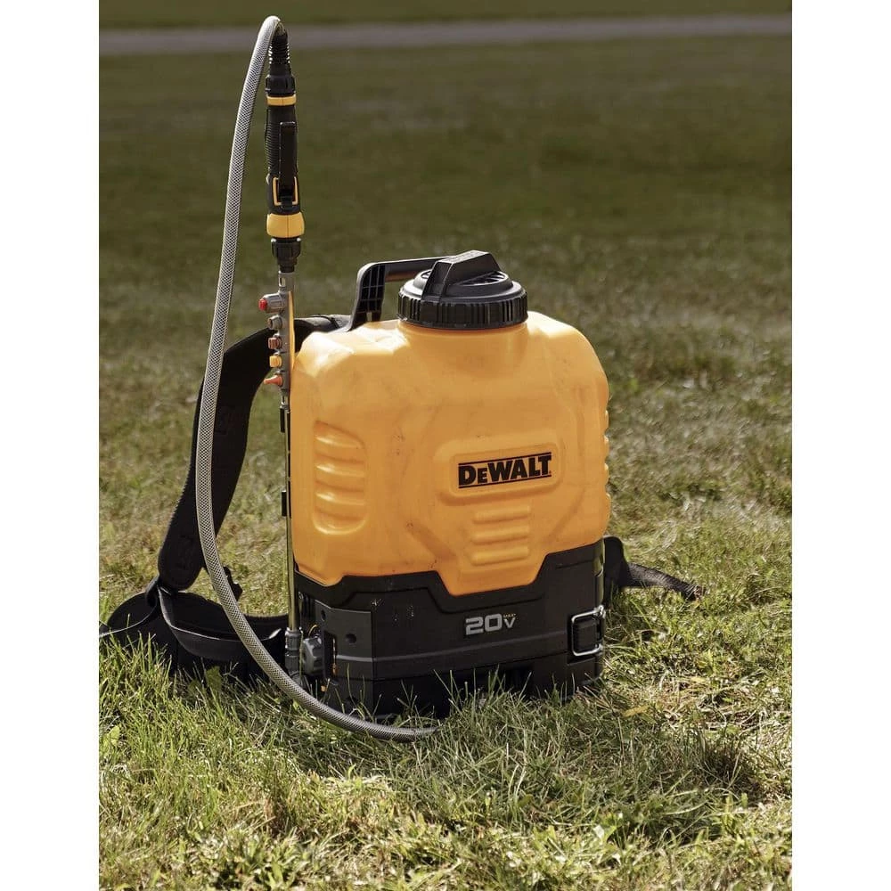 The DEWALT 4 Gal. Lithium-ion Powered Backpack Sprayer has been built to outperform, outlast and finish the job in less time – with no more pumping. The lithium-ion powered backpack sprayer has Variflo technology which allows the operator to adjust the flow for multiple applications using specific nozzles for consistent spraying. This sprayer has a deluxe harness with wide, padded shoulder straps that fit snug across the torso and curve to the contour of the user’s body. An adjustable hip harness assists with weight distribution, relieving burden from the user’s shoulders. Multiple nozzle tips are included for versatility in both application rates and patterns and can be stored on the included nozzle clip. Equipped with a comfort grip handle and lock-on mechanism, this shut-off system can be easily operated with heavy-duty work gloves. It includes a 50 in. heavy-duty nylon-reinforced hose and strain relief system preventing the hose from kinking at the chemical exit point. This sprayer unit is also equipped with chemically resistant Viton seals throughout to withstand the effects of harsh chemicals. Whether it’s for weeding and feeding, disinfecting, finishing concrete, eliminating mold or controlling pests – users are equipped for the Job. It’s GUARANTEED TOUGH.