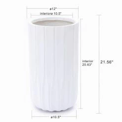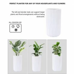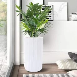 Tall planters are a great for giving smaller plants height, giving larger plants room to grow, and providing height to areas that have a smaller footprint. This eye-catching round tapered planter features fluted vertical lines that gives the planter depth and dimension. The bright white finish lends the planter a contemporary style. The planter is crafted using weather and UV-resistant magnesium oxide material, making it ideal for your front porch, patio, deck or garden. It includes a drainage hole to help prevent over-watering your plants. It also includes a drainage plug for your convenience. Bring the tall planter inside and brighten up your entryway, Sun room, or family room. This impressive planter is aesthetically pleasing that will work well indoors or outdoors, whether housing your favorite plant or as a stand alone art piece.