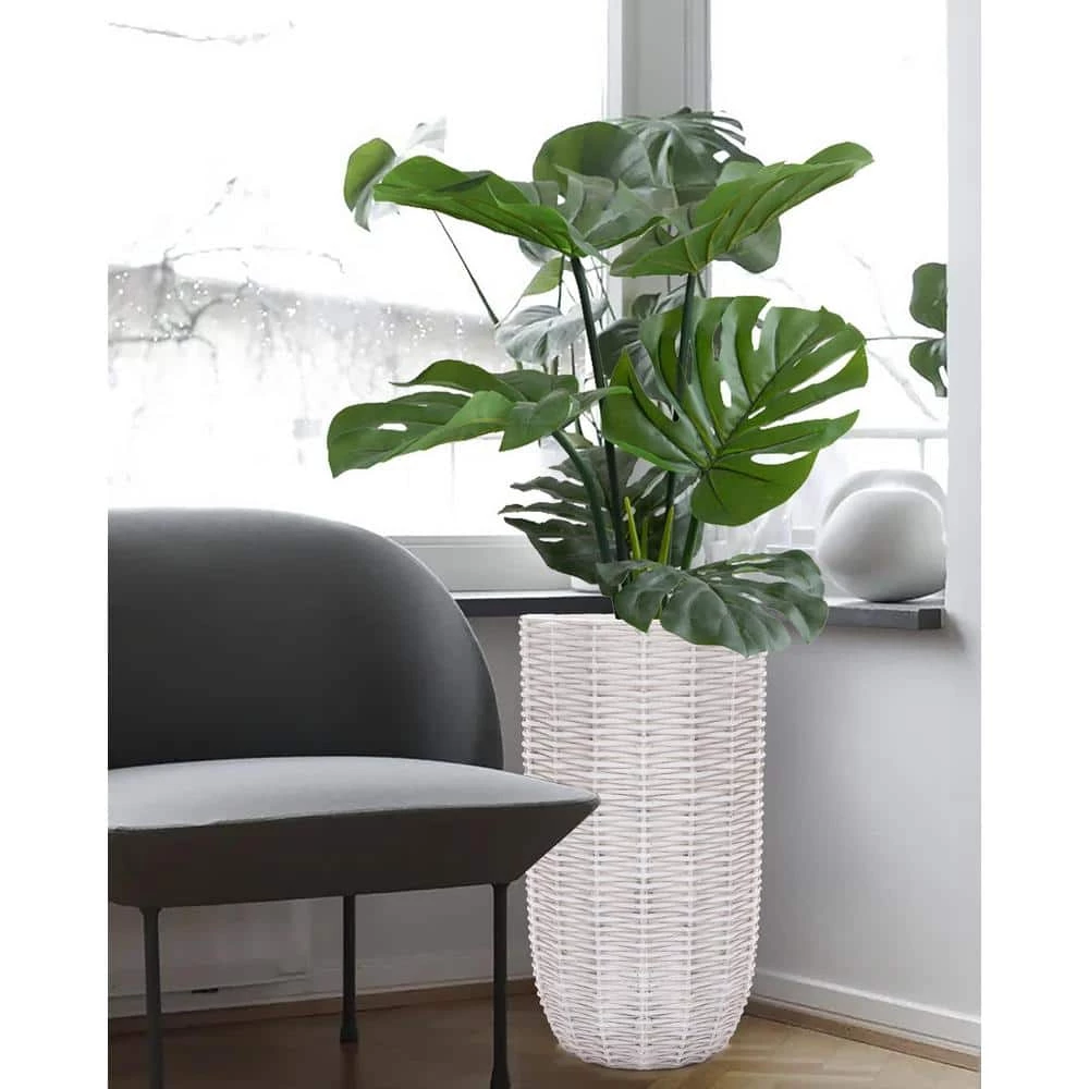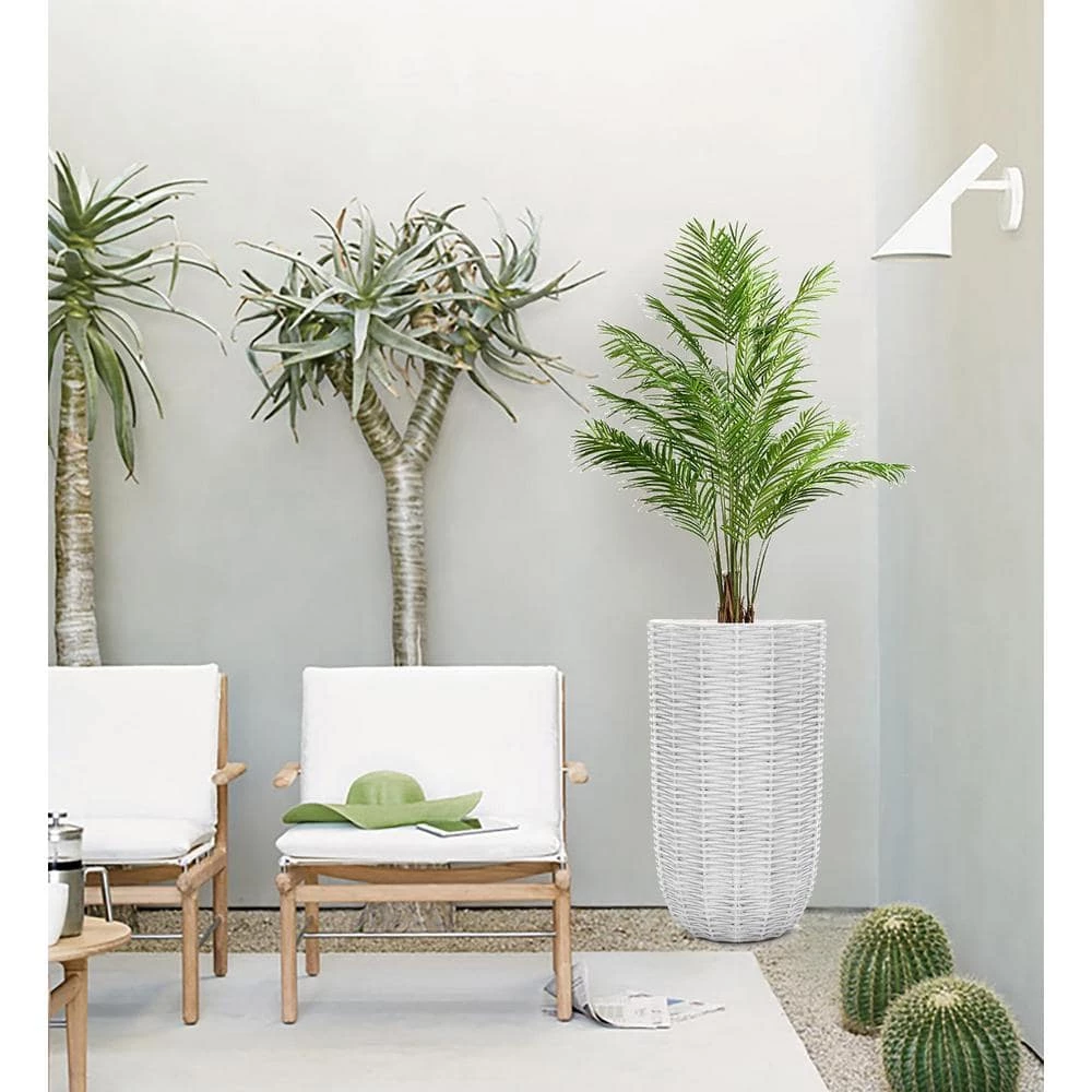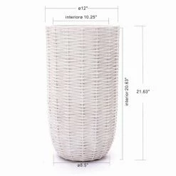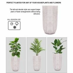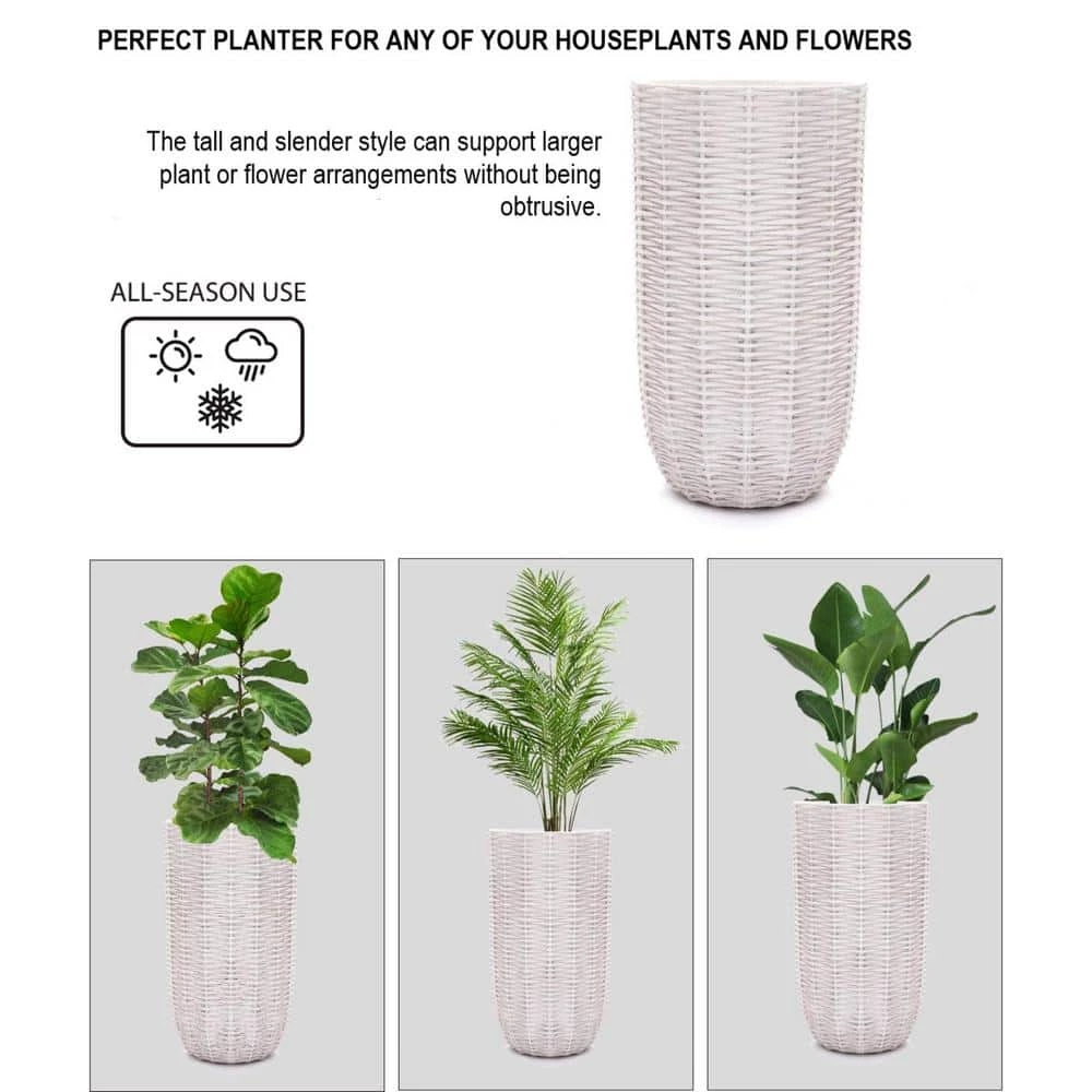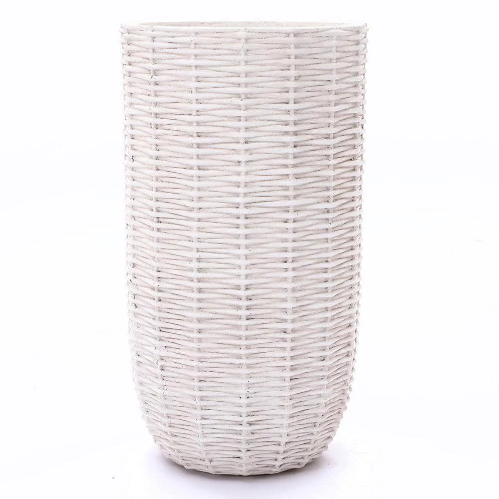 Tall planters are a great for giving smaller plants height, giving larger plants room to grow, and providing height to areas that have a smaller footprint. This eye-catching round tapered planter has a Floridian-inspired rattan design that gives the planter depth and dimension. The rustic off white finish lends the planter an old-style retro charm. The tall planter is crafted using weather and UV-resistant magnesium oxide material, making it ideal for your front porch, patio, deck or garden. It includes a drainage hole to help prevent over-watering your plants. It also includes a drainage plug for your convenience. Bring the tall planter inside and brighten up your entryway, Sun room, or family room. This impressive planter is aesthetically pleasing that will work well indoors or outdoors, whether housing your favorite plant or as a stand alone art piece.