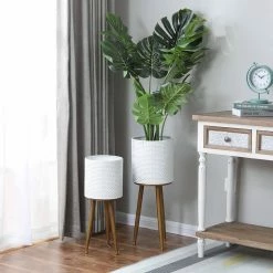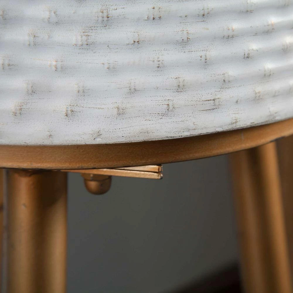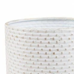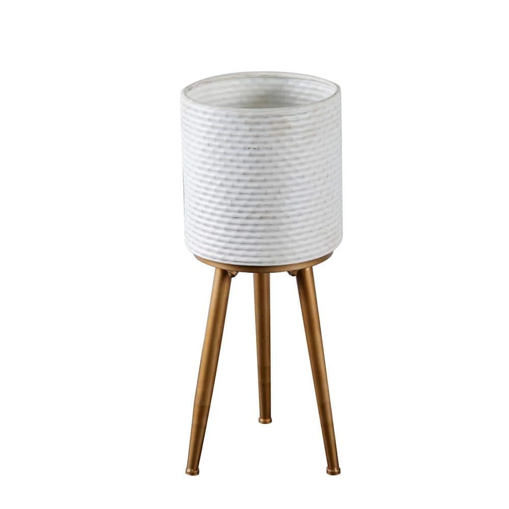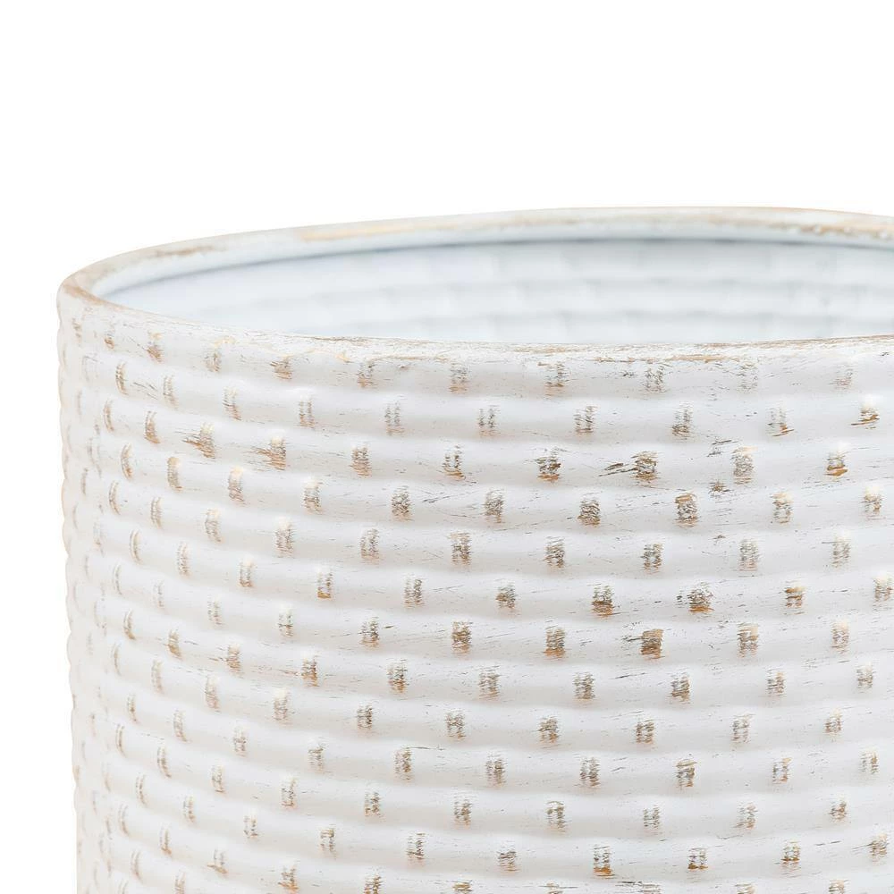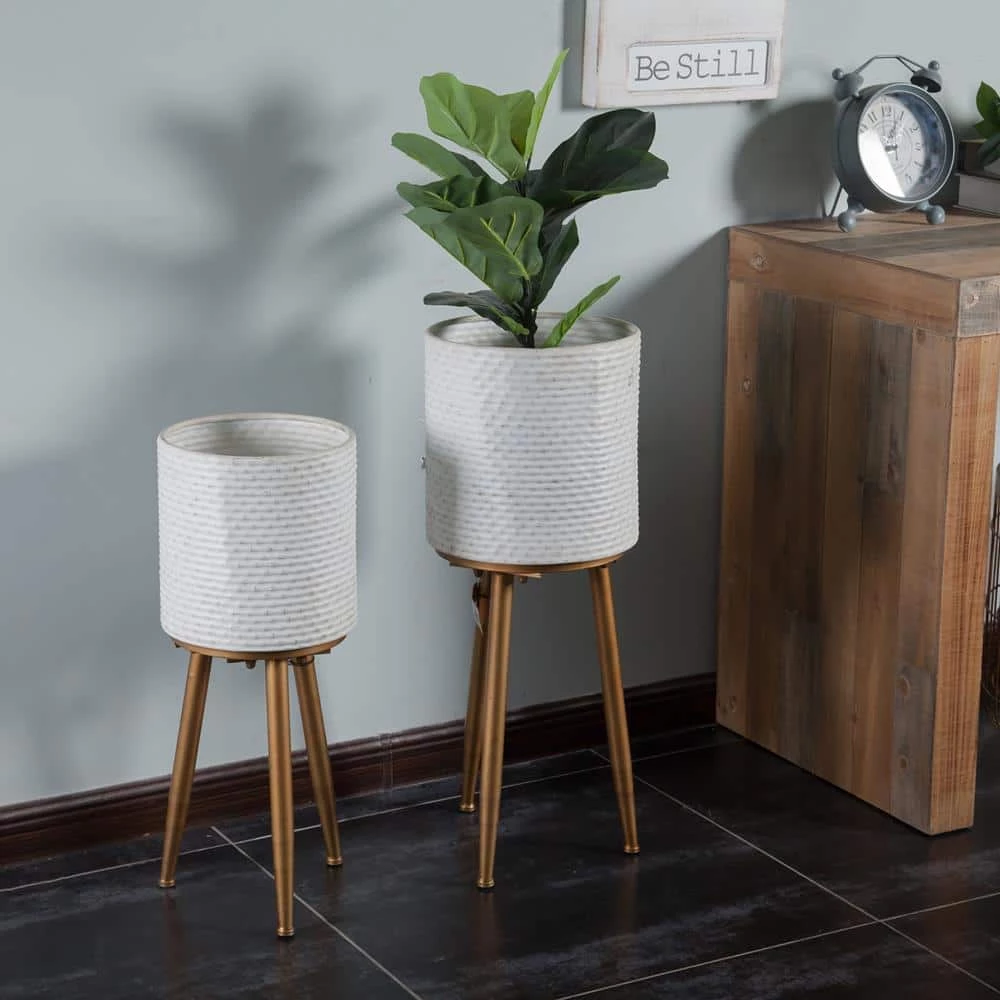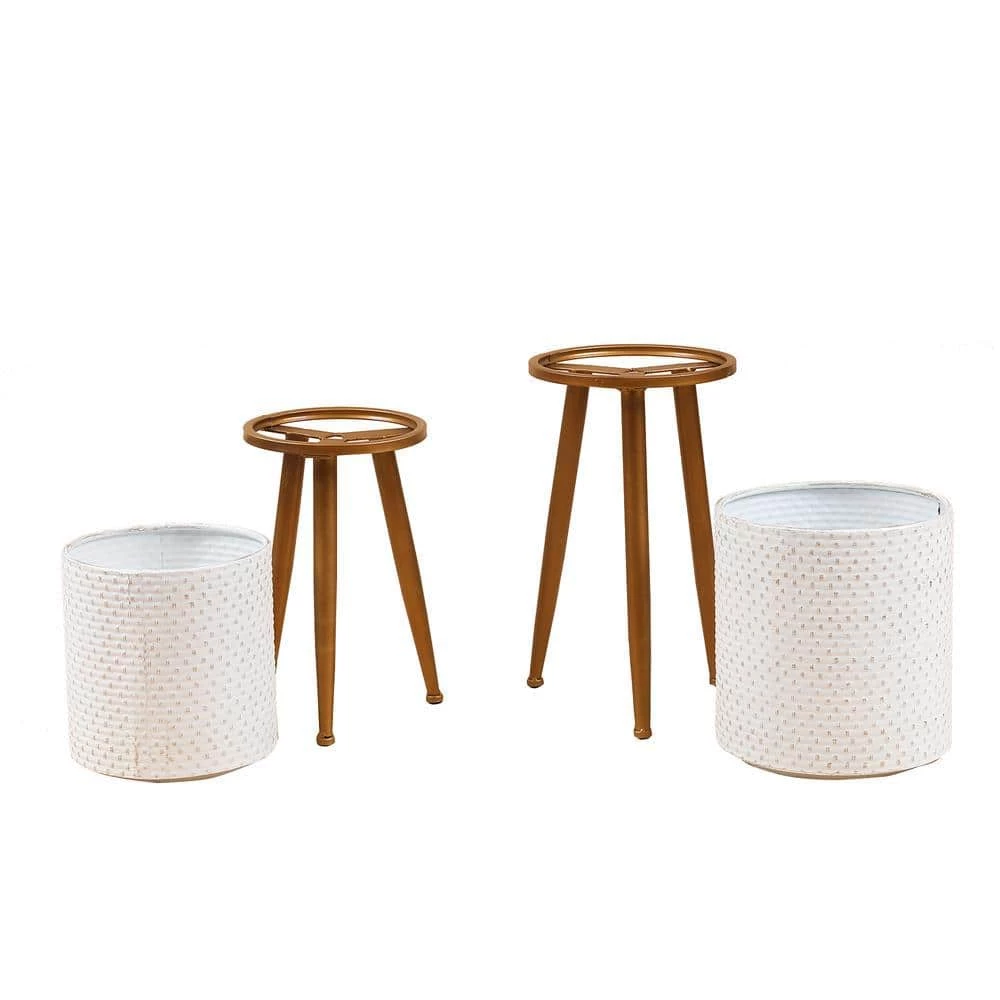 This 2-piece pot planter set gives your plants a stylish place to rest. Elevate your greenery in this gorgeous metal cachepot in a hammered and distressed white finish, and tripod stand in a bronze finish. Each metal planter fits easily on its stand, and dresses up any style. The set includes a large and small cachepot planter that is identical in style and finish. Add a finished look to your plant, with the set of large and small metal containers. Cachepots are a great solution for your bringing in your outdoor planters inside without having to re-pot your plant. The stylish distressed white finish with hammered dimpled effect is the perfect complement to the green plants you grow. The unique industrial-modern style pot is the best choice for your living room, bedroom or entrance. These beautiful metal pots are recommended for indoor use. The purpose for the metal containers is to be used a cachepots, and they are not waterproof.