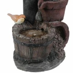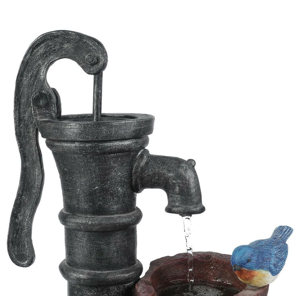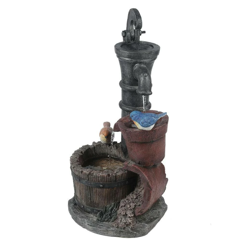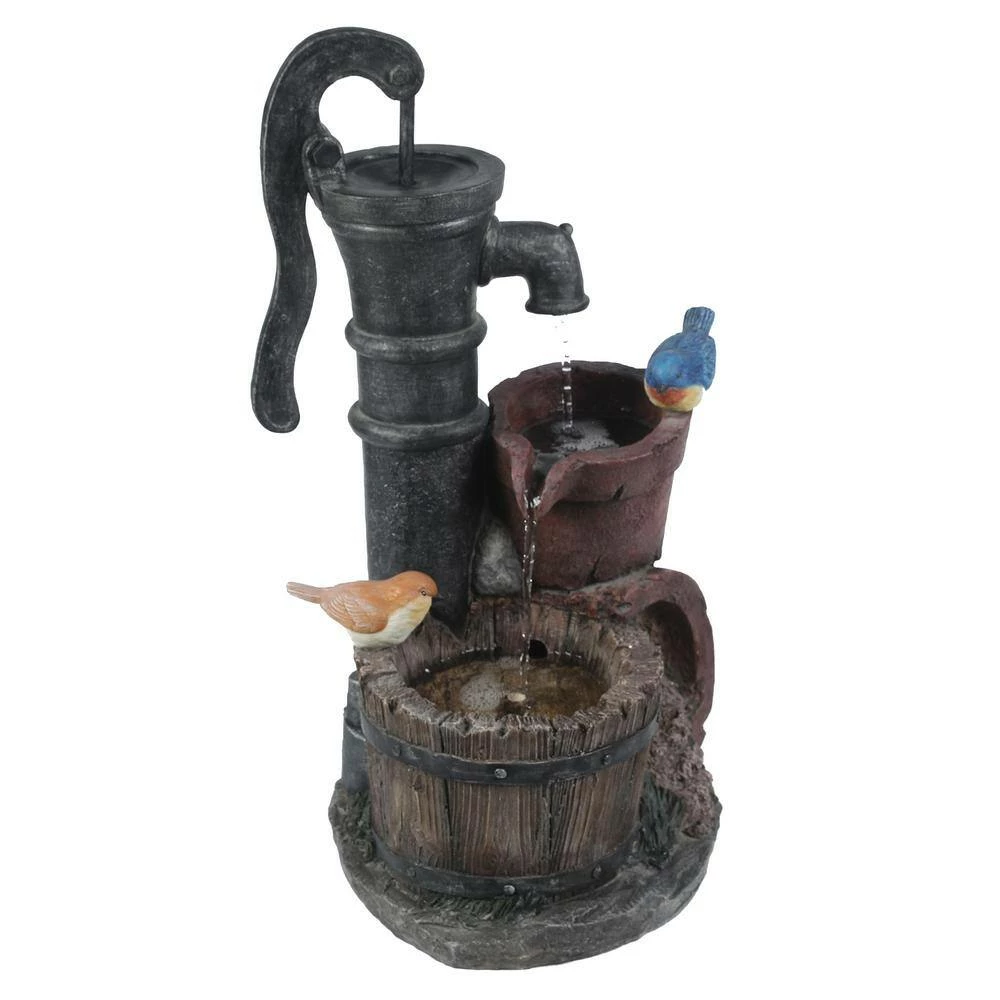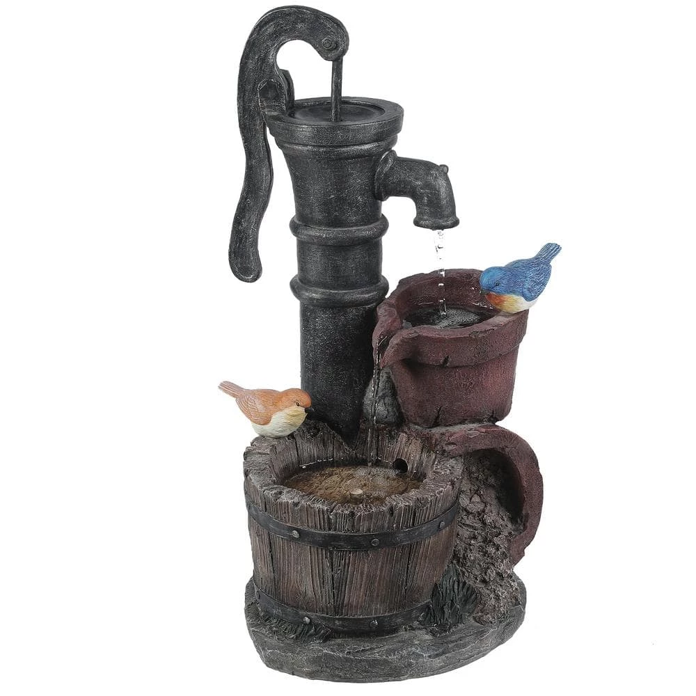 Give your garden or patio a whimsical touch with the rustic water pump and 2 birds perched on the pots of this outdoor polyresin fountain. The water pump drips the water into the flower pot which pours the water into the whiskey barrel below. The fountain can be placed anywhere in a garden or patio space delivering an impressive addition to your home. The sound and sight of bubbling water is sure to help tie the serene garden together. Electric pump is included.