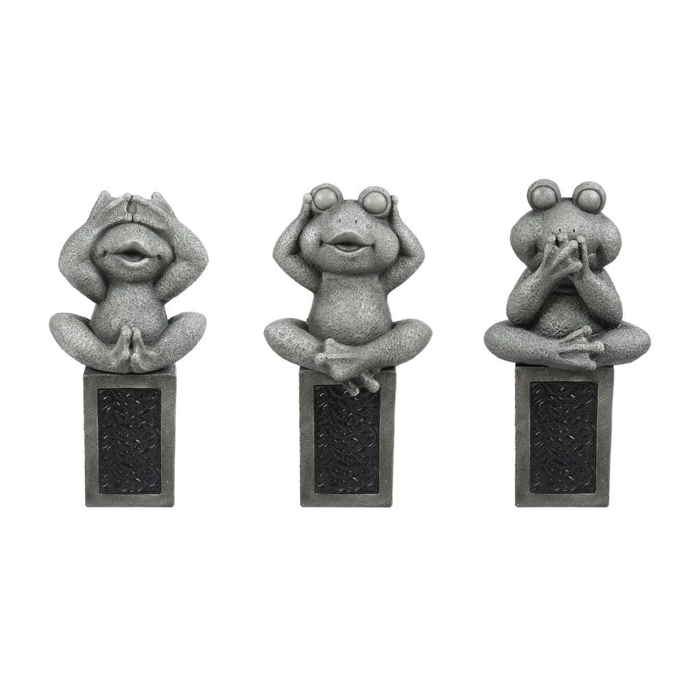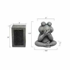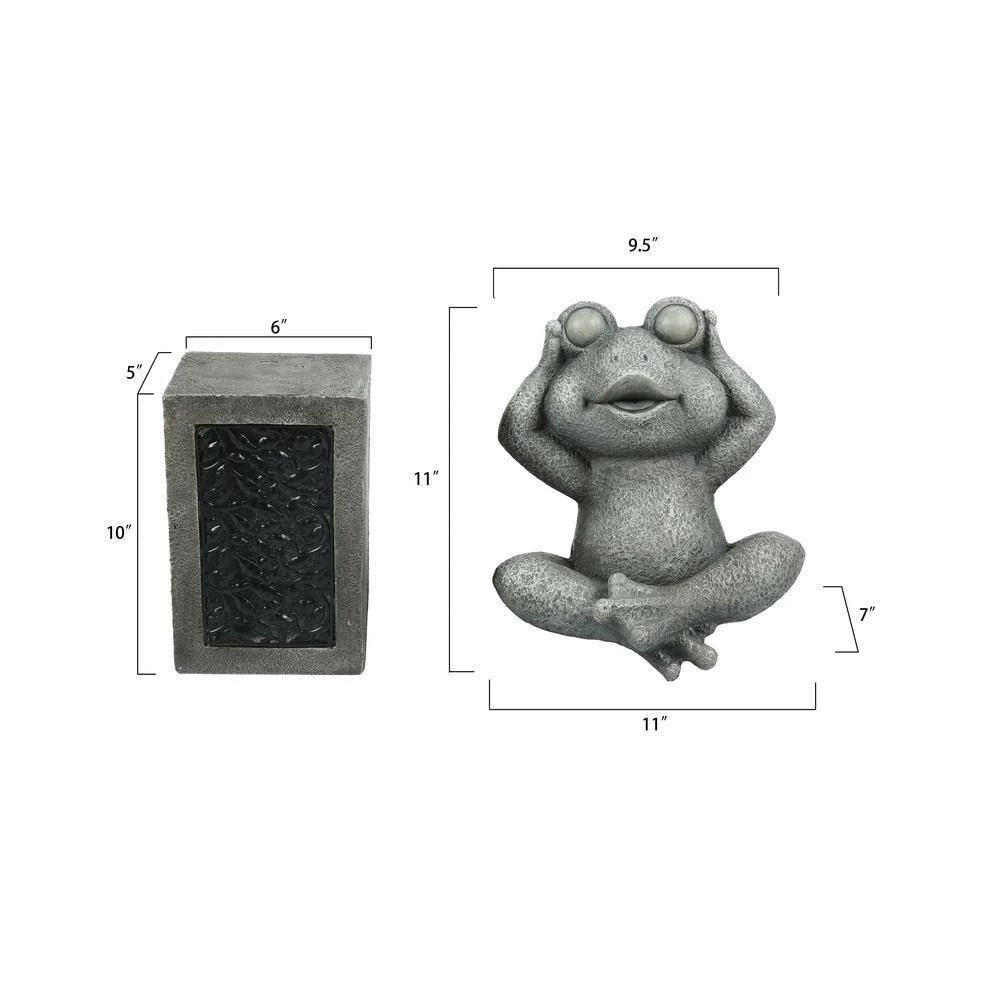 This unique yard decoration is adds a playful charm everyone will love. This set of three frog statues is actually a 6-piece set with the three columns included for the frogs to sit on. The statues and columns are crafted using weather- and UV-resistant magnesium oxide material. The columns have a leaf scroll motif in a black finished metal on the body of the column. This is where the solar powered light shines through so you can enjoy this adorable set in the evening as well. This fun twist of see, hear, and speak no evil frog statues sit on the columns and can be displayed together or spread them out throughout your garden, backyard, or deck. You can create your own look since the frogs and columns are separate pieces. This adorable three piece set also make a wonderful housewarming gift!