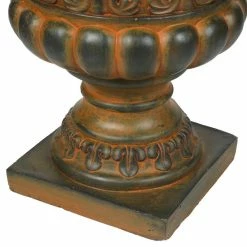 This ornate, weathered burnt orange finish urn planter is made of magnesium oxide, also called magnesia. The round pot is suitable for year round use outdoors in your garden, patio, or porch. With its beautiful details, the urn planter will make a warm addition to your indoors as well. The round planter is 19.9 in. H making it ideal for your medium-sized foliage and plants. With its traditional design, it is sure to add the finishing touch to your decor. The planter includes a drainage hole.