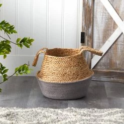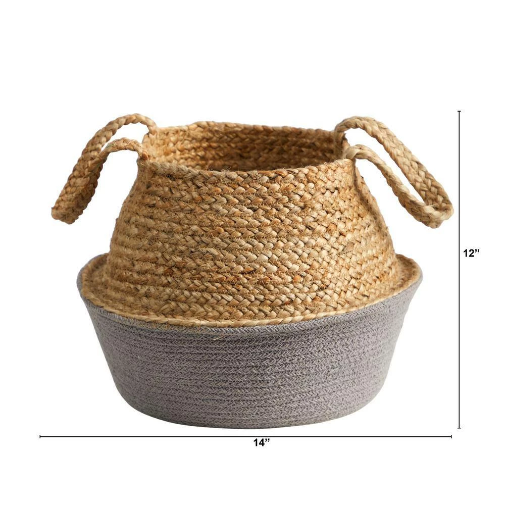 Nearly Natural 14 in. Gray Boho Chic Handmade Cotton and Jute Woven Basket Planter