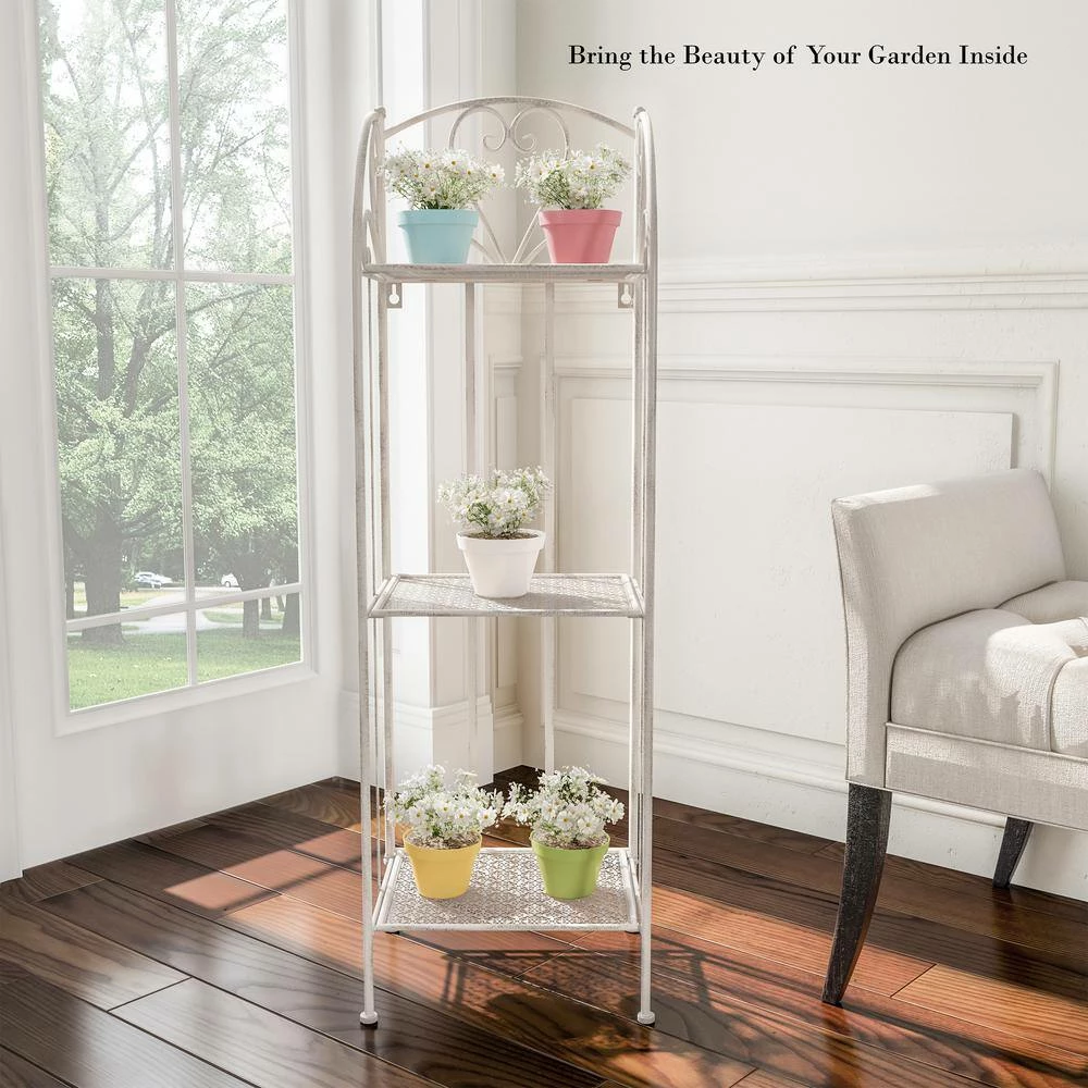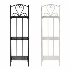 Bring vintage charm to your home or garden with the 3-Tier Folding Wrought Iron Plant Stand by Pure Garden. This flower and greenery display features laser-cut scrollwork and a wrought iron-inspired design to be a charming focal point for your lawn or home. The metal frame is powder coated with a white paint in an antique finish to resist rust and corrosion and is lightweight enough to easily move from spot to spot without sacrificing strength. Each folding shelf allows you to create a unique arrangement and the whole frame folds and nests in itself for convenient storage. The plant stand features single-piece construction so it’s ready to use straight out of the box. It makes a great Mother’s Day, housewarming or birthday gift.