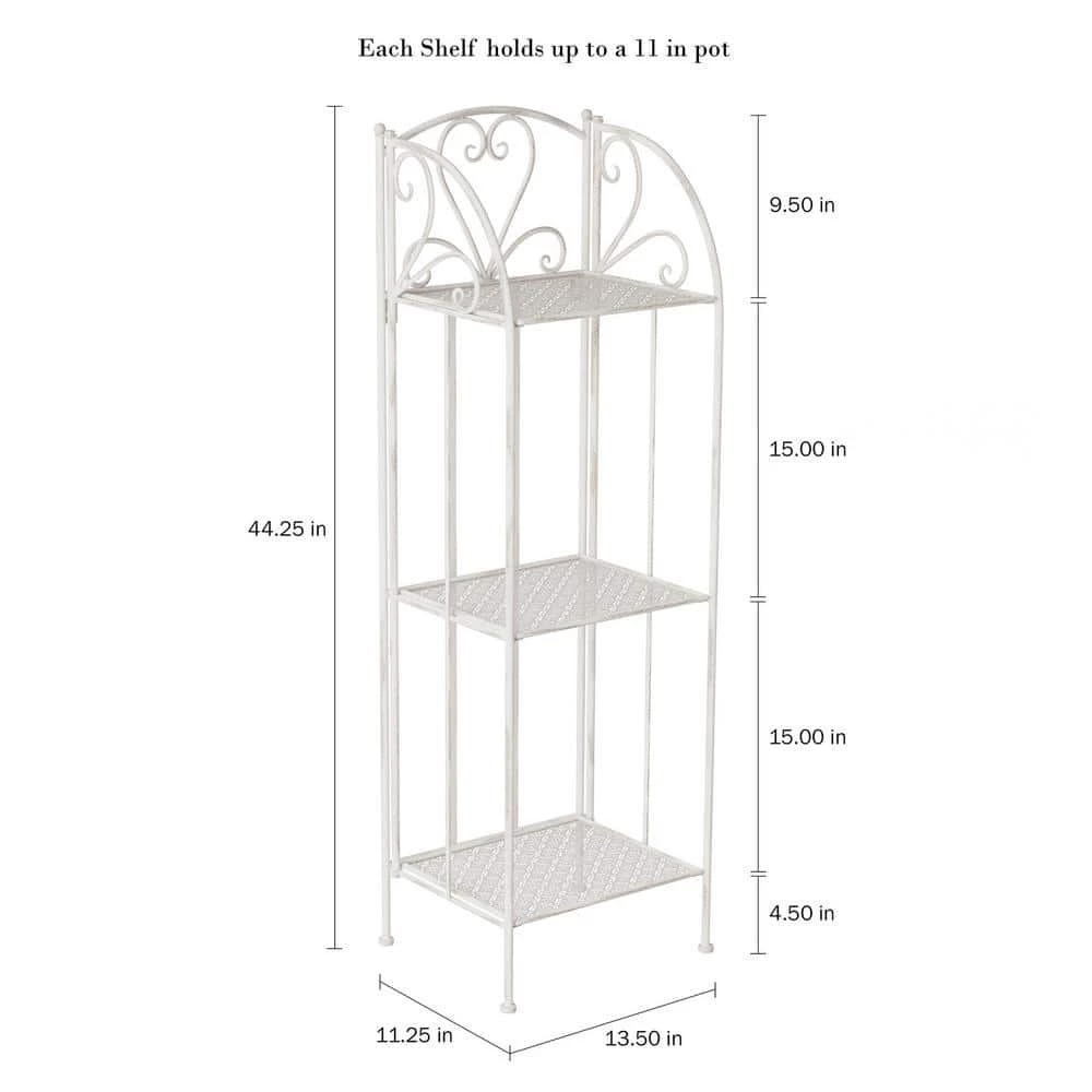 - PRODUCT DETAILS- Materials: Metal. Overall Dimensions: 13.5″ L x 11.25″ W x 44.25″ H. Shelf Clearance: 15″ H. Ground Clearance: 4.5″ H. Color: Antique White.