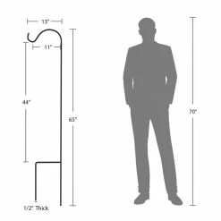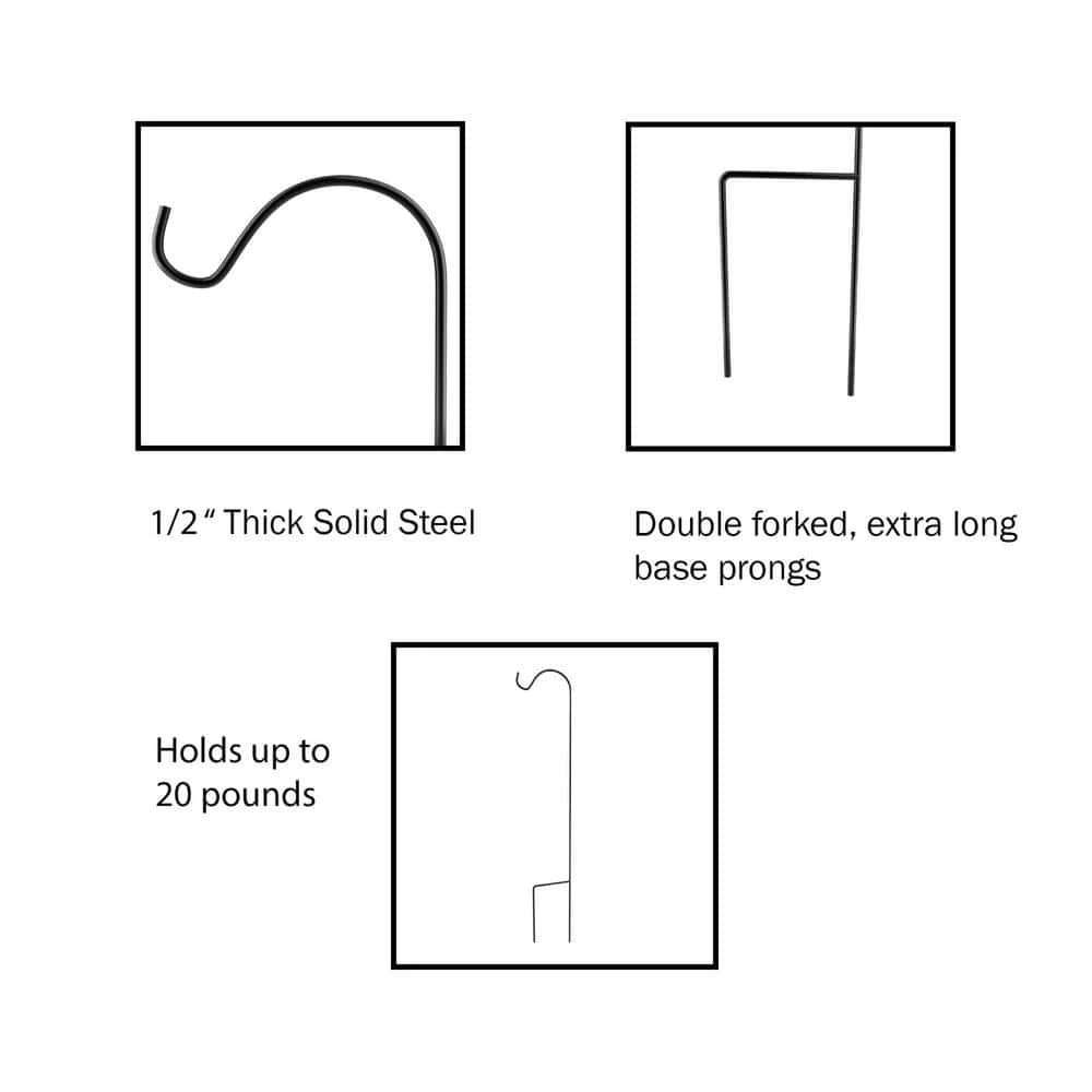 - PRODUCT DETAILS – Materials: Powder Coated Solid Steel. Dimensions: Overall: (L) 13″ x (W) 0.50″ x (H) 65″; From Top of Ground Stake to Hook: (H) 44″; From Hook to Main Pole: (L) 11″. Weight Capacity: 20-Pounds Each. Color: Black.