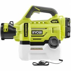 The RYOBI 18V ONE+ Cordless 1/2 Gal. Electrostatic Sprayer allows you to spray water soluble disinfectants and other cleaning solutions with the convenience of battery power. RYOBI This handheld sprayer is compact and lightweight for comfortable, 1-handed operation. Engage the on/off switch to activate the electrostatic technology or to deactivate it when using chemicals best suited for conventional spraying. You can spray up to 30 Tanks per charge with the included 18V ONE+ Battery, which is compatible with all RYOBI 18V ONE+ tools. The 3-in-1 Adjustable Nozzle Selector allows you to choose from multiple spray patterns, simply turn the nozzle to select between Low, Medium and High. The low setting sprays 65 microns up to 2 ft. away, the medium setting sprays 85 microns up to 5 ft. away and the high setting sprays 160 microns up to 10 ft. away. This sprayer comes equipped with 3 low, 1 medium and 2 high nozzles making it easy to complete jobs of multiple sizes. The RYOBI 18V ONE+ Cordless 1/2 Gal. Electrostatic Sprayer includes an 18V ONE+ 2.0 Ah Battery and Charger which is compatible with Over 260 ONE+ tools and is backed by a 3-year warranty.