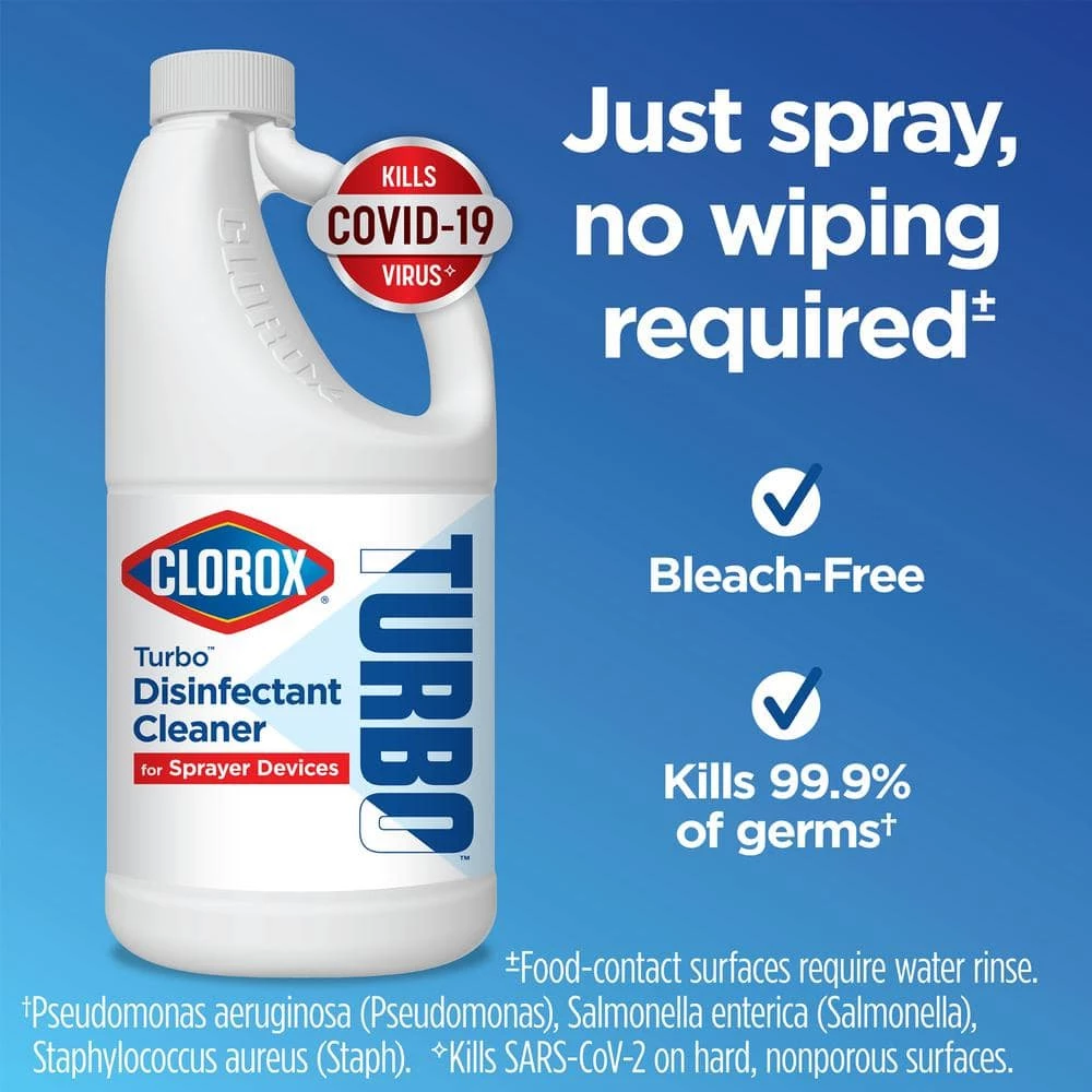 - CLOROX TURBO DESIGNED FOR SPRAYER DEVICES: Use this formula to disinfect quickly and easily. When used with a sprayer device, all you have to do is spray, there’s no wiping required