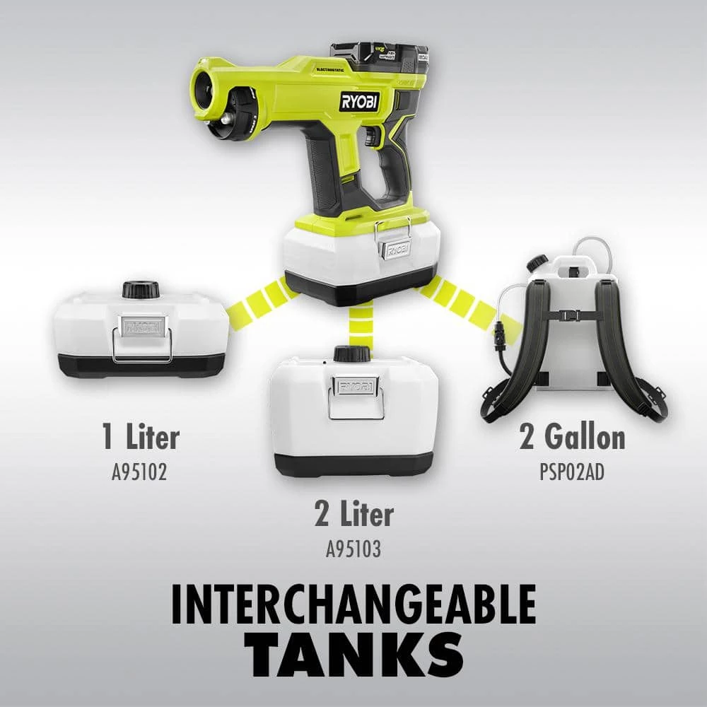The RYOBI 18V ONE+ Cordless Handheld Electrostatic Sprayer allows you to spray disinfectants, cleaning solutions, and deodorizers with cordless convenience. RYOBI Electrostatic Sprayers utilize electrostatic charging technology to positively charge particles to allow solutions to cover surfaces quicker and more evenly, reducing chemical use and increasing efficiency. These charged particles enable solutions to more effectively wrap around a wide range of high touch surfaces. This handheld electrostatic sprayer features an ergonomic design to reduce user fatigue and increase portability. Spray up to 45 tanks per charge with an 18V ONE+ 2.0 Ah battery. This sprayer reaches up to 5 ft. and has an on/off switch to activate the electrostatic technology. The tool-free 3-in-1 adjustable turret allows you to easily change between 50, 75, and 100 microns for a variety of spray patterns, cleaning applications, and chemical dwell time requirements. The tool-free removable nozzles allow users to easily clean and replace nozzles. The removable 1-liter tank has a flat base for hands-free, easy filling. This sprayer is compatible with additional tank sizes for added versatility. Best of all, it is part of the RYOBI ONE+ System of over 260 cordless tools that all work on the same battery platform. Backed by the RYOBI 3-Year Manufacturer’s Warranty, the 18V ONE+ Cordless Handheld Electrostatic Sprayer includes an operator’s manual. Battery and charger sold separately.