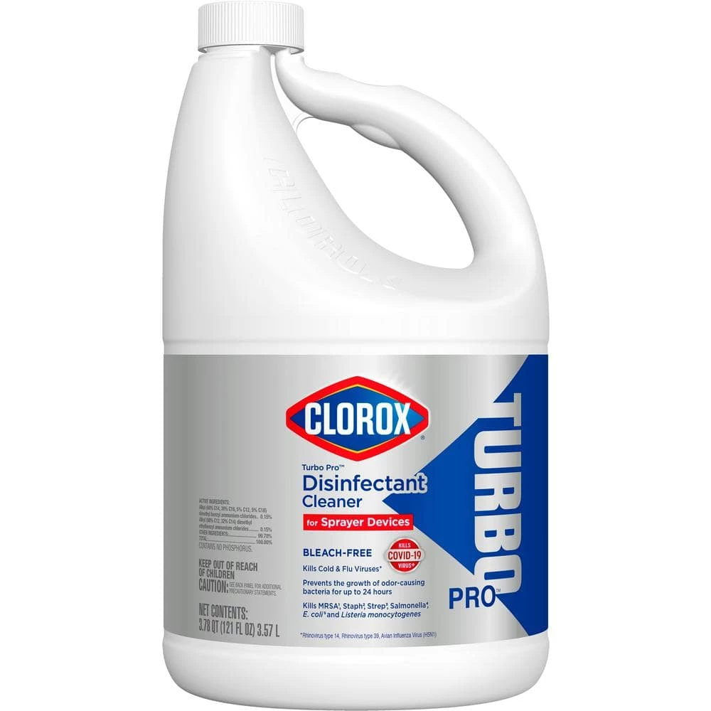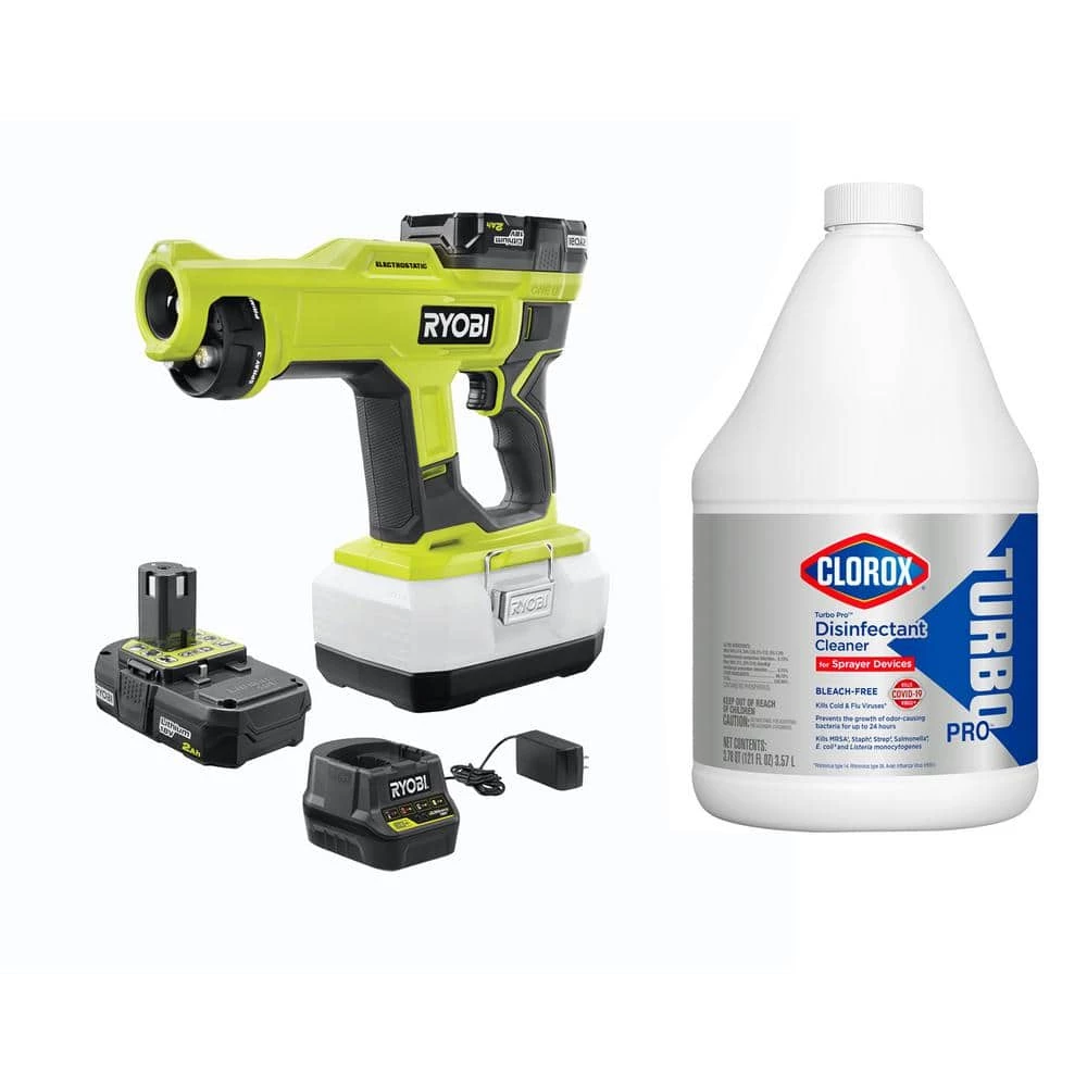 The RYOBI 18V ONE+ Cordless Handheld Electrostatic Sprayer Kit allows you to spray disinfectants, cleaning solutions, and deodorizers with cordless convenience. The tool-free removable nozzles allow users to easily clean & replace nozzles. The removable 1-liter tank has a flat base for hands-free, easy filling. This sprayer is compatible with additional tank sizes for added versatility. Best of all, it is part of the RYOBI ONE+ System of over 260 cordless tools that all work on the same battery platform. Backed by the RYOBI 3-Year Manufacturer’s Warranty, the 18V ONE+ Cordless Handheld Electrostatic Sprayer Kit includes two 2.0 Ah Battery, an 18V Charger, & an operator’s manuals. Get your entire space Clorox clean in minutes with Clorox Turboâ„¢ Disinfectant Cleaner that kills 99.9% of germs, including COVID-19*. The Clorox Turbo Disinfectant Cleaner is specially formulated for use with a variety of sprayer devices. This bleach-free formula disinfects high-touch surfaces quickly and easily. Ideal for a wide array of facilities. When used with a sprayer device, all you have to do is spray, there’s no wiping required.