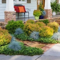The Fire Chief (Thuja) Arborvitae is a nearly perfectly globe-shaped shrub that has finely textured, bright golden spring foliage and fantastic deep red fall color. This sport of the popular Rheingold variety has more intense coloration and is less prone to splitting. No pruning is necessary to maintain its compact, rounded form. Perfect for massing in the landscape foundation or as a rock garden specimen.