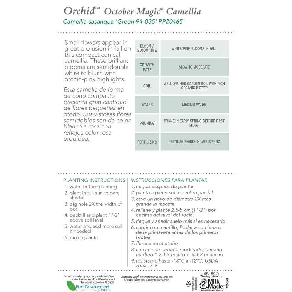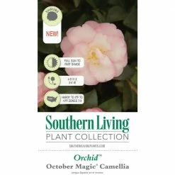 Camellias expand possibilities in your fall and winter garden providing a large variety of colors and bloom forms. October Magic Rose Camellias yield small flowers appear in great profusion in fall on this compact conical camellia. These brilliant blooms are semi-double white to blush with orchid-pink highlights.