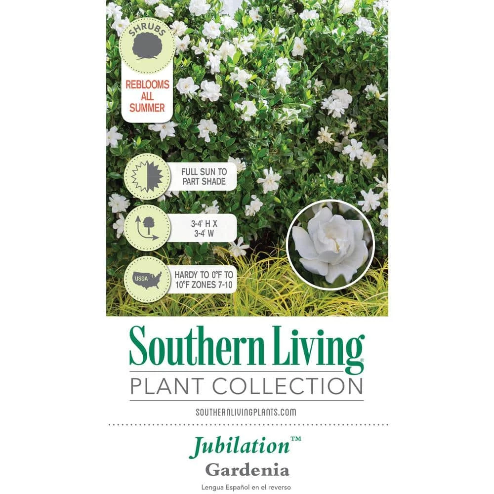 The Jubilation Gardenia is a charming improvement on a Southern favorite. It features milky white, double form blooms with a rich aroma and it re-blooms throughout the summer. The dark green, glossy foliage is evergreen. Jubilation grows more compact than traditional gardenias and is perfect for smaller areas of the garden.
