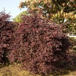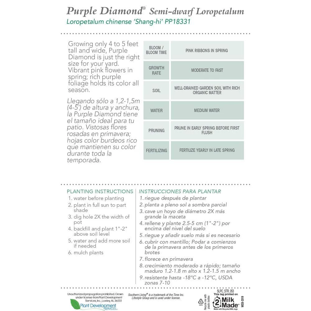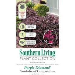 Loropetalum Purple Diamond is a beautiful purple leaf loropetalum that will never overwhelm your house. It matures to a modest 4 ft.-5 ft. tall and 4 ft.-5 ft. wide. Showy bright pink blooms appear in spring and occasionally in summer. The evergreen foliage holds its dark purple color all year.